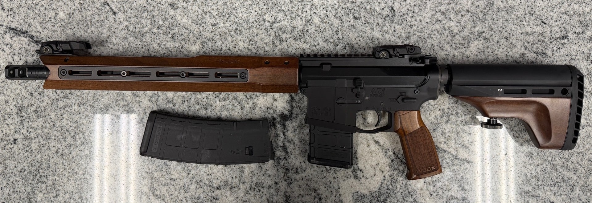 ARJ ARJ15 CUSTOM RIFLE 5.56 14.5″ PINNED WITH WOOX FURNITURE 2-MAGS NO-BOX/CASE BLACK/WOOD USED ARJ00118