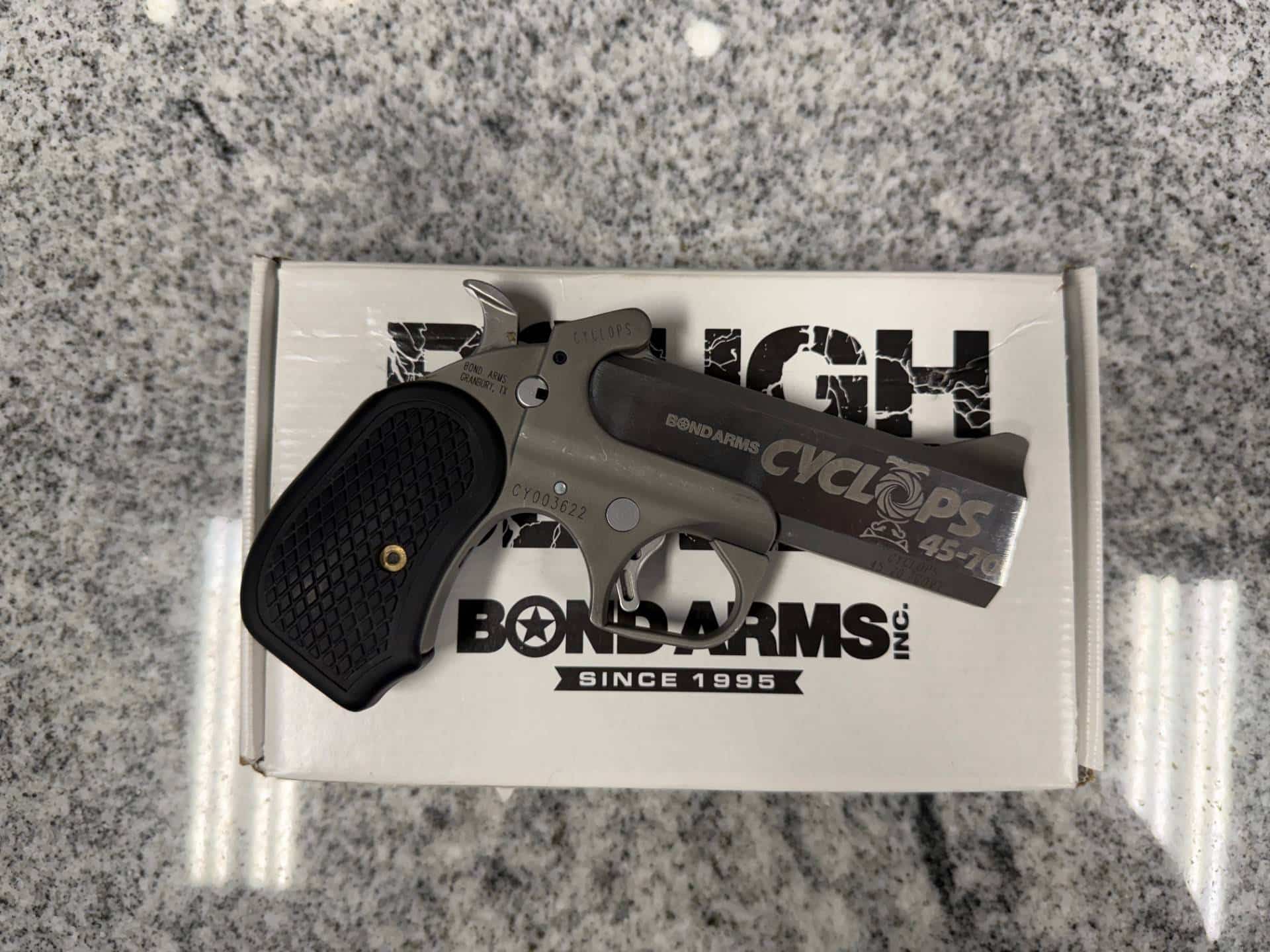 Home / Used Fireams / BOND ARMS CYCLOPS 45-70 GOV 4.25″ SINGLE SHOT PISTOL WITH ORIGINAL BOX CY003622 BOND ARMS CYCLOPS 45-70 GOV 4.25″ SINGLE SHOT PISTOL WITH ORIGINAL BOX CY003622$389.00 1 in stock [{"type":"checkbox-group","required":true,"name":"checkbox-group-1656342078656-0","values":[{"label":"I understand this product MUST BE SHIPPED TO AN FFL\/SOT. PLEASE SUBMIT FFL INFO to ockie@gerbranddefense.com","value":"","uid":"04bbfbcf4614b","selected":false}]}] BOND ARMS CYCLOPS 45-70 GOV 4.25" SINGLE SHOT PISTOL WITH ORIGINAL BOX CY003622 quantity Add to cart UPC: CY003622 SKU: CY003622 Category: Used Fireams Product ID: 46661 Description Description . Related products Out of stock IWI GALIL ACE SAR 7.62X39MM RIFLE 16″ GEN1 1-MAG 30RD ORIGINAL BOX BLACK USED G0003954 $1,799.00 Read more KAHR PM9 BLACK DIAMOND 9MM 7+1 1MAG 3″ ORIGINAL CASE BLACK USED VB9825 $499.00 Add to cart COLT MATCH SPORTER HBAR .223 20″ PREBAN W/ CASE AND 3-40RD MAGS BIPOD SLING USED BLACK MH044356 $1,699.00 Add to cart REMINGTON 700 SENDERO FLUTED 28″ 22-250 REM W/ MAGNA PORTING NO CASE USED S6250096 $2,499.00 Add to cart