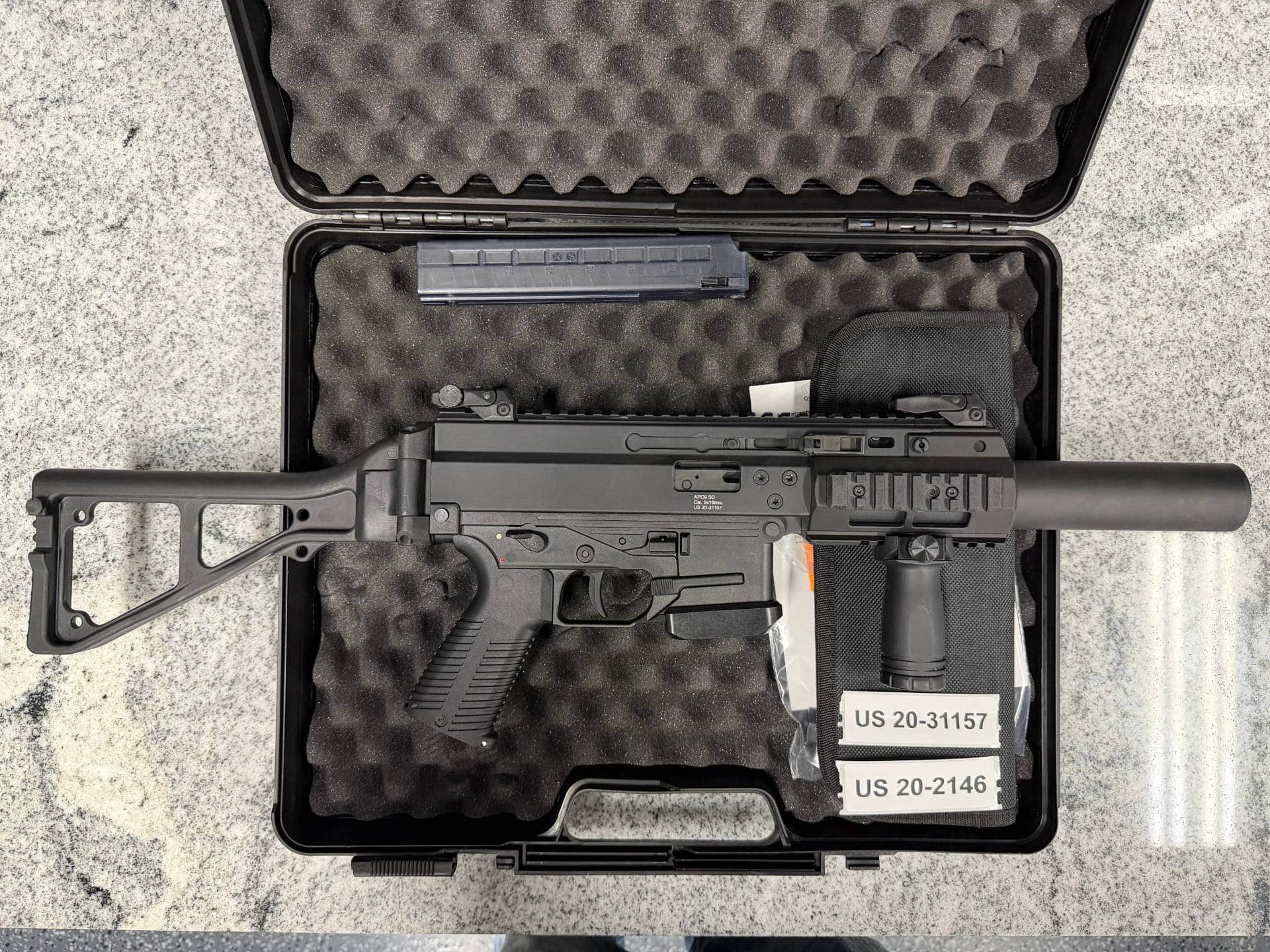 B&T APC9 SD 5.75″ SBR 9MM 1-MAG ORIGINAL CASE W/ AP9 SD SUPPRESSOR BLACK USED US20-31157 & US20-2146