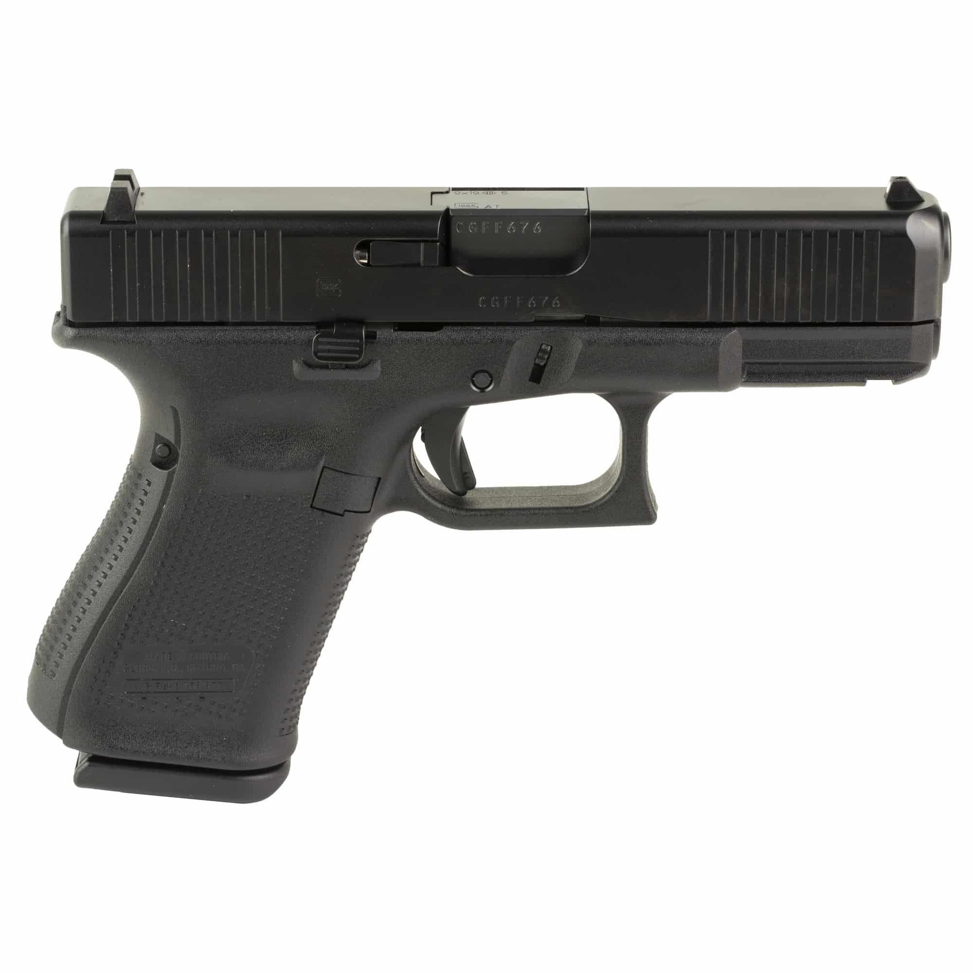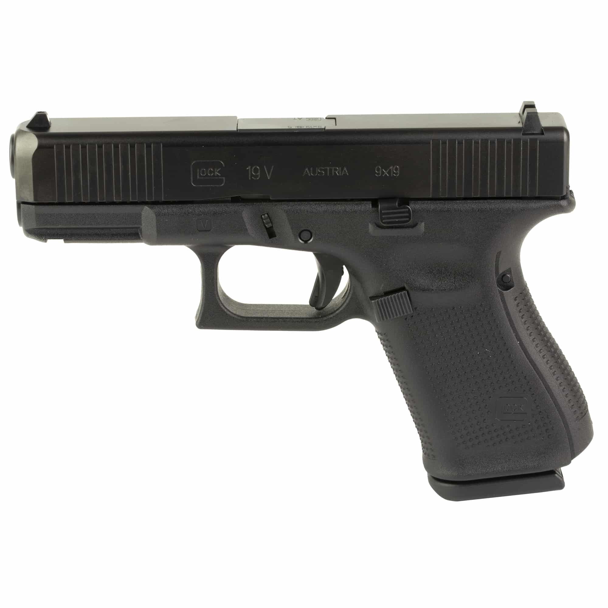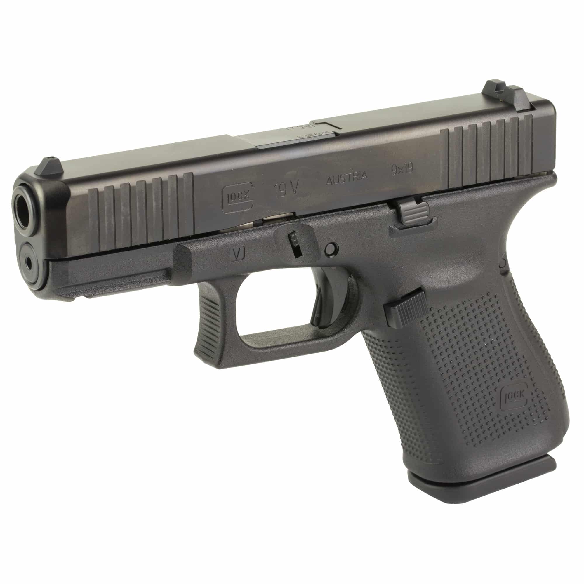 The GLOCK 19 V pistol is versatile for many roles due to the reduced size. The frame design without finger grooves allows the user to customize the grip width to accommodate any hand size by mounting the different back straps. The reversible magazine catch is changeable at user level, as well as the ambidextrous slide stop lever to accommodate left and right-handed operators. The G19 V pistol features the GLOCK Marksman Barrel (GMB), nDLC surface finish, front serrations, an ambidextrous slide stop lever, and more.